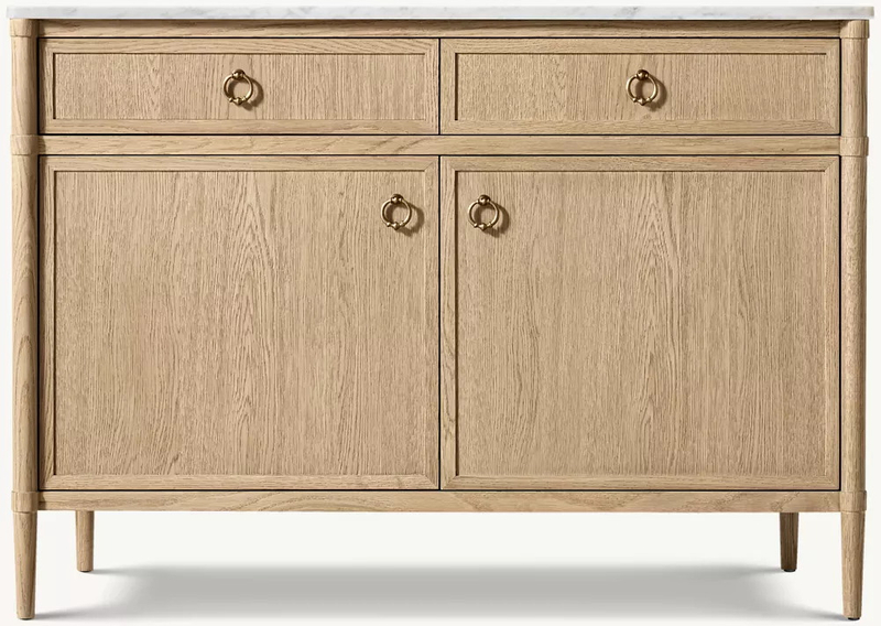 Caractéristique décorative : chaque buffet est doté d'un « caractère unique » grâce à sa texture naturelle. La combinaison de poignées rétro et de lignes simples en fait non seulement une pièce de rangement mais aussi un point focal visuel (le plan de travail peut contenir des objets décoratifs).