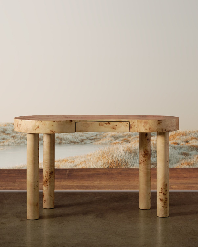 Ceci est un tableau distinctif. Fabriqué à partir de bois avec des textures de burl, il a un ton de bois clair qui dégage une sensation simple et naturelle. La table ovale se marie avec quatre pattes cylindriques, créant une forme lisse et minimaliste. Il y a un seul tiroir au milieu, qui est à la fois fonctionnel pour le stockage et le décoratif. Dans l'ensemble, il mélange la simplicité naturelle avec une touche artistique, ajoutant un charme unique à un espace et bien s'adapter à divers styles de maison qui apprécient la nature et un sens du style.