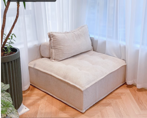 Il s'agit d'une pièce de sièges de niveau de plancher avec un style minimaliste. Le corps principal est en tissu beige, et la conception touffue à la surface ajoute de la texture et des détails. Le coin salon large est associé à un coussin de couleur assorti, créant une expérience assise confortable. Il est placé par la fenêtre, où les rideaux transparents blancs filtrent doucement la lumière. La plante verte luxuriante à côté et le plancher en bois se complète, créant une atmosphère naturelle, chaude et tranquille dans son ensemble. C'est un choix idéal pour se détendre et profiter du soleil.