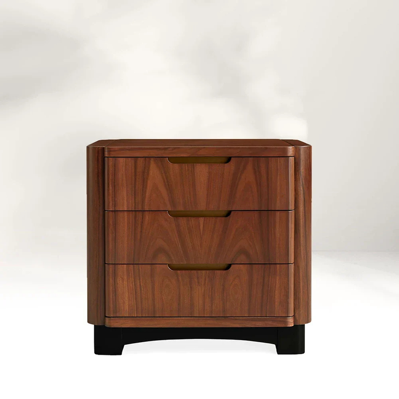 Cette table de nuit présente un design raffiné, avec un corps en bois riche avec une finition lisse et polie qui met en évidence les motifs de grains naturels du bois. Ses trois tiroirs, équipés de poignées subtilement intégrées, offrent à la fois des fonctionnalités et une esthétique élégante. La base sombre contrastée ajoute une touche d'élégance moderne, ce qui en fait une pièce polyvalente qui complète divers styles de chambre tout en offrant un espace de stockage pratique.