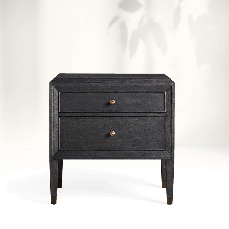 Cette table de nuit dégage une élégance discrète avec sa construction élégante et en bois noir. Les deux tiroirs, ornés de boutons de laiton minimalistes, offrent un stockage pratique tout en maintenant une silhouette propre et raffinée. Les jambes effilées avec des accents métalliques subtils aux pieds ajoutent une touche de sophistication moderne, ce qui en fait une pièce polyvalente qui complète le décor de chambre contemporain et classique.